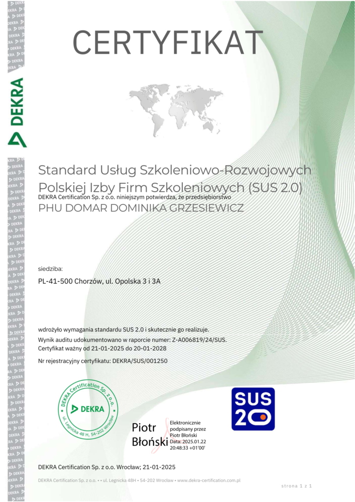 DOMAR Grzesiewicz Szkolenia posiada wpis do Bazy Usług Rozwojowych (BUR) oraz ważny certyfikat SUS 2.0. Oznacza to, że nasze usługi szkoleniowe i doradcze spełniają wymagania jakościowe stawiane podmiotom działającym w systemie BUR oraz są przygotowywane w sposób uporządkowany, mierzalny i możliwy do weryfikacji.